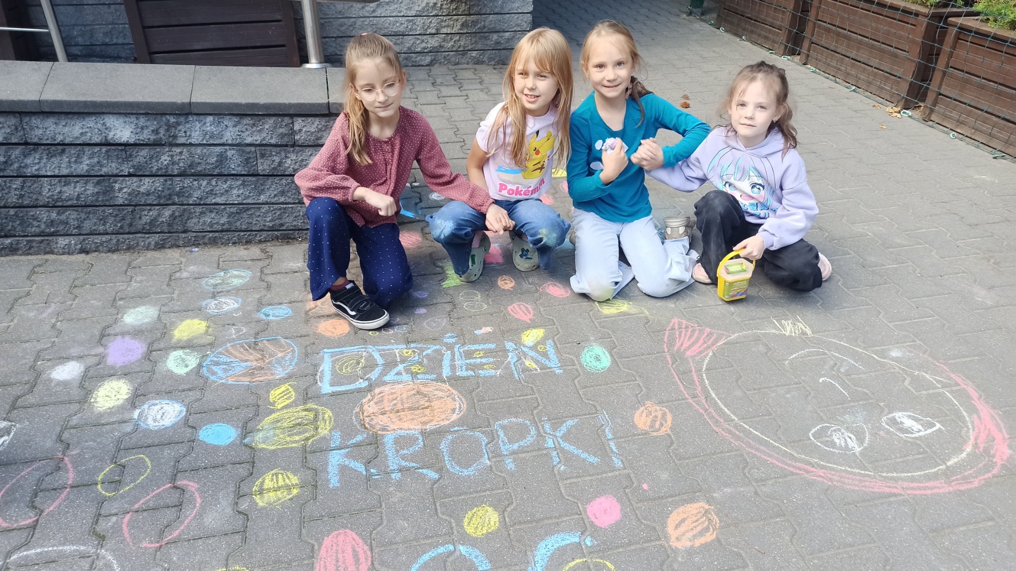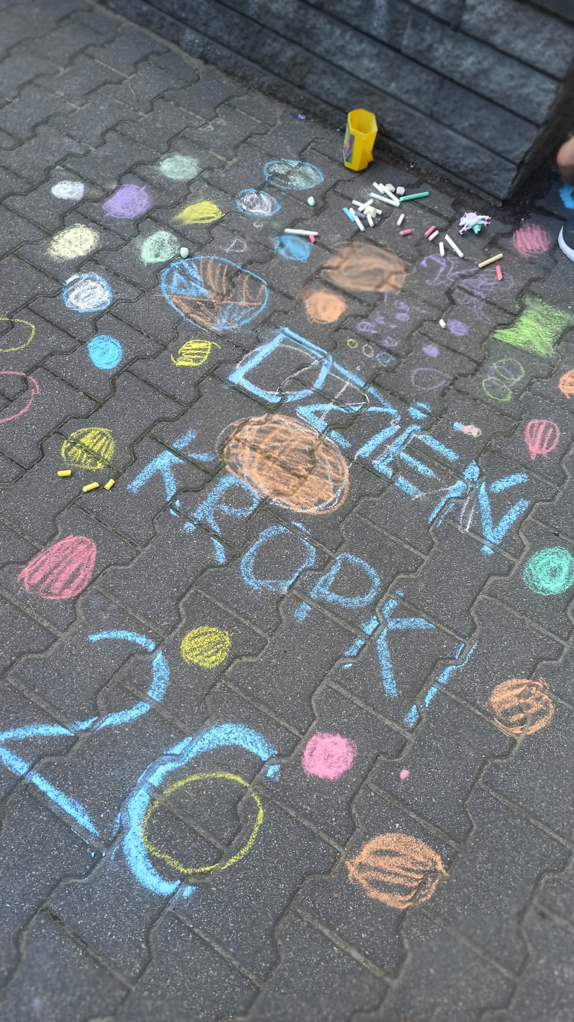 Nie ograniczyliśmy się jednak do pracy w sali – wyszliśmy także na dwór, gdzie ozdobiliśmy chodnik barwnymi kredowymi kropkami. Nasza świetlica zamieniła się w prawdziwą „aleję kropek”, pełną kolorów i radości.